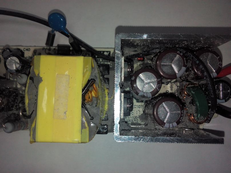 Beet, Через герметик тепло не отводят. Его теплопроводность крайне низка. У этого блока транзистор и диод передают тепло через алюминиевую пластину. Такие же пластины есть во всех более менее приличных блоках, даже с пластмассовым корпусом. Верх и низ теплоотводящих пластин закрыт алюминиевым кожухом который еще и заземлен на общий провод блока. Это у пластмассовых блоков так. Без экрана блоку не пройти сертификат на уровень помех.