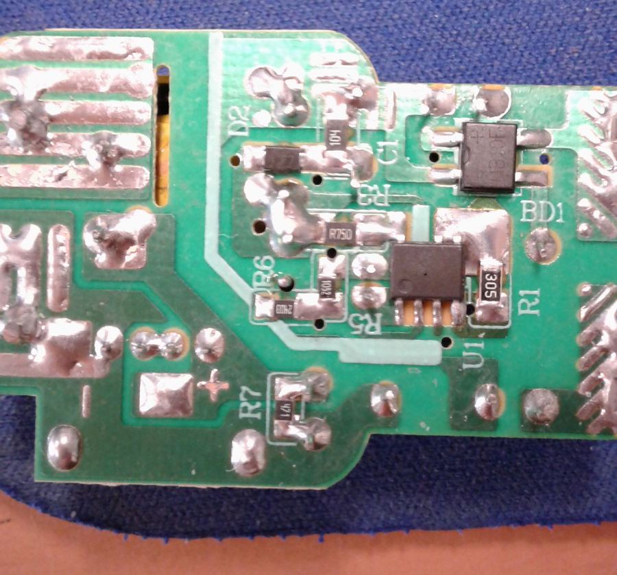 попалось неработающее ЗУ, в корпусе как от самсунга. схема не вполне типичная, в трансформаторе всего 1 обмотка первичной, а обр. связи или демагнетизации - нет.