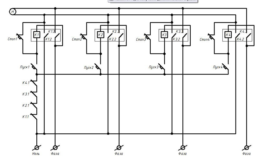 По этой схеме на одни и те же контакты реле цепляются разные фазы (она работоспособна, если у всех одна и та же фаза). И как контакты на разрыв соединять, если по той схеме на каждом реле его контакт на разрыв нужно отдельно выносить? И как такая схема будет работать? |