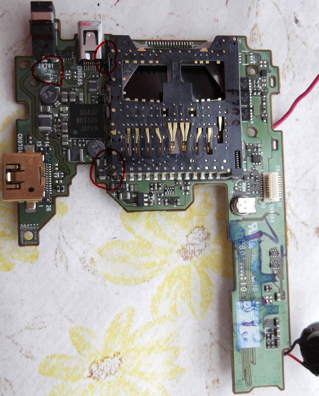 С обратной стороны платы (со стороны объектива) в трёх точках вокруг отсека SD-card белый налёт (фотки 2 и 3 разной крупности), под этим отсеком в зоне ограниченной видимости на одной из деталей угадывается зелёный окисел (слева по кадру внутри щели на фотке 4). Отпаивать отсек не стал.