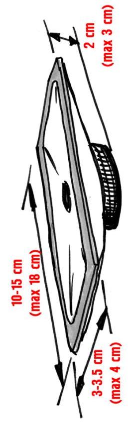 Динамик прямоугольный: ширина 3-3,5см (макс 4см), длина 10-15 см (макс 18 см), высота 2 см (макс 3 см).