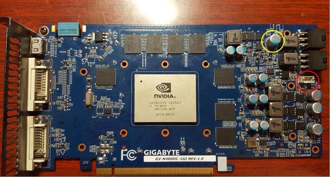 Стояла у ребенка на компе видеокарта Gigabyte Nvidia GTX 460 (GV-N4600C-1GI) и в один момент комп ушёл в перезагрузку и больше не включился. После вскрытия обнаружились не крутящиеся вентиляторы на видюхе. Карту заменили на новую, а с неисправной пытаюсь разобраться.