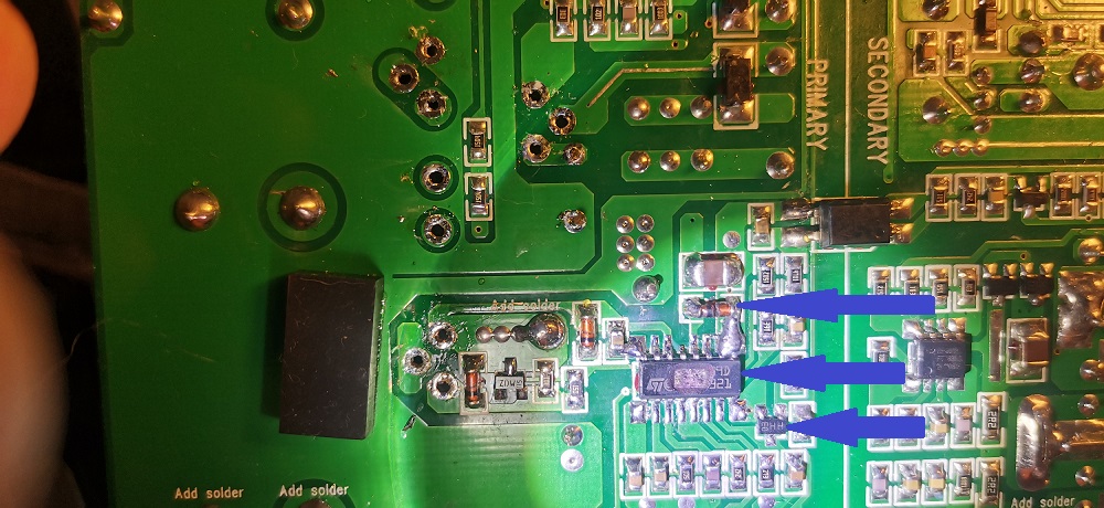 У меня к вам пару вопросов, скорее всего просьба: 1. При покупке блок был в разобранном состоянии, вентилятор отсоединен, от него выходят два провода, один трехжильный и двухжильный. Подскажите каким проводом и куда подключается вентилятор; 2. Какое обозначение на вашей плате smd элементов (диод, трехнога в корпусе sod 23) в районе взорванной микросхеме?