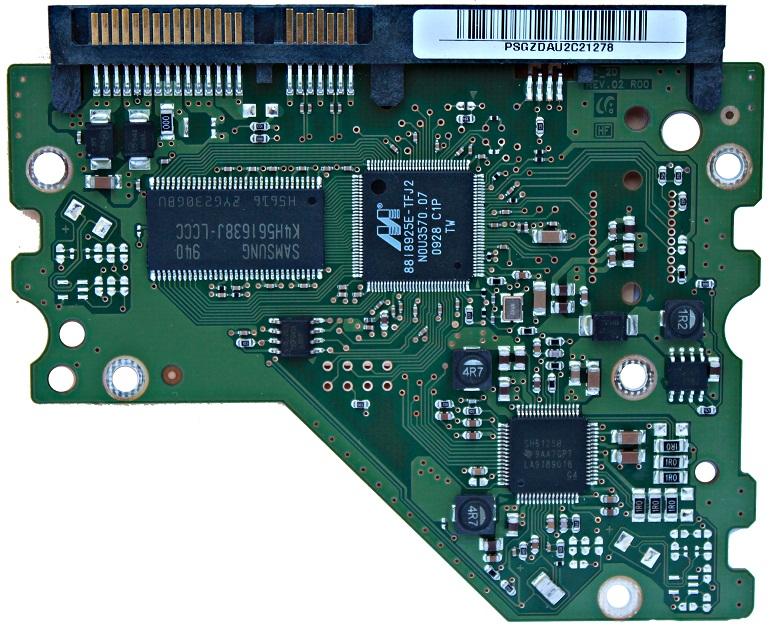 ПЗУ может находиться как в отдельной ИМС на плате контроллера, так и в маске проца (у более новых моделей, особенно это характерно для 2,5" винтов). В данном случае, для Samsung HD502HJ, ПЗУ внешнее, это восьминожка под ИМС ОЗУ, вот ее-то и надо перепаивать при замене платы контроллера, см. фото: