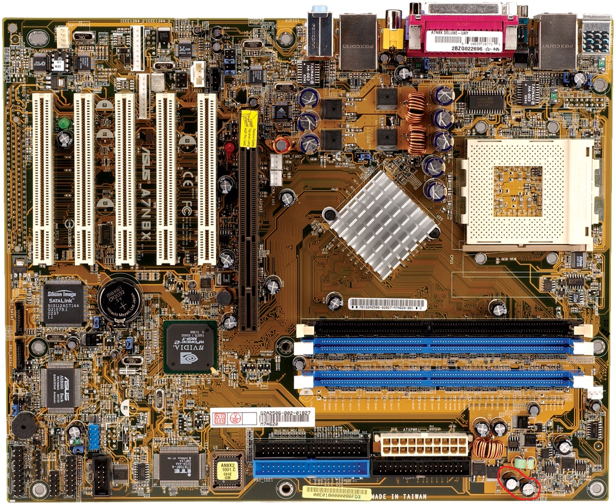 Плата поступила не рабочей (хотя говорили что когда-то работала), с двумя вздувшимися кондерами - см. вложение. Заменил на тот же номинал 820 на 6,3 CapXon LZ.