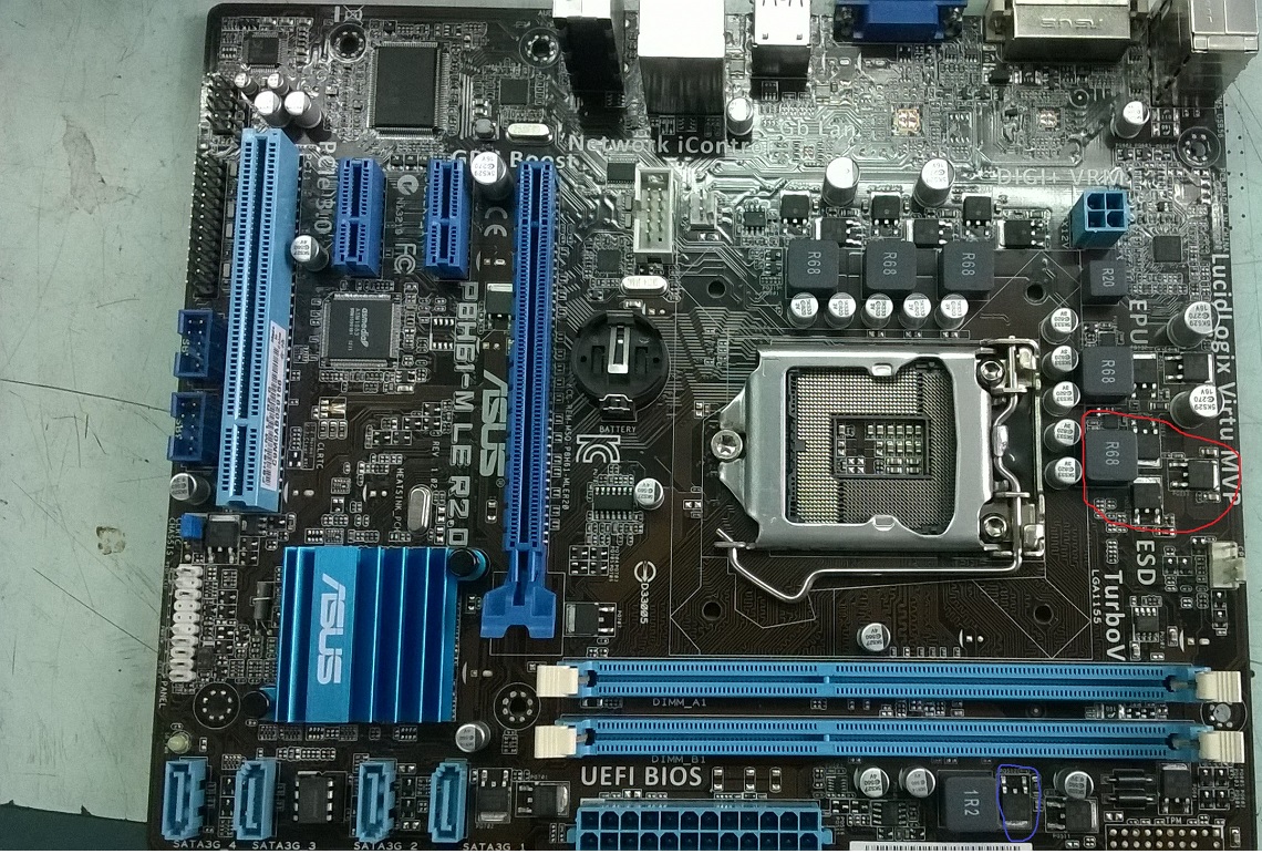Единственное что смущает на нижнем дросселе возле проца (отм. красным) нет напряжения, на крайний с права транзистор приходит 12В, но с него никуда ничего не выходит. Транзисторы выпаивал проверял мультиметром. И снизу возле слота с памятью транзистор (отм. синим) на крайней левой ноге "0".
