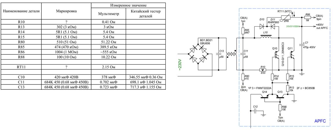 Замерил остальные элементы блока APFC по схеме; резисторы не выпаивал (пожалуйста, см. вложение).
