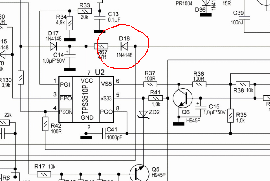 Смотри еще прикол отпаял я D15 поставил тестер на 3- ногу визора Оказалось странное : Если включить блок питание напруги на выходе все есть куллер крутится ,на 3 ноге 0,08 В но как только подключаешь нагрузку на 3 ноге появляется напруга 4,15 в и она не спадает !! хоть откидывай нагрузку хоть не откидывай .Только возвращается в норму после 10 секунд откл . питания . Соттветственно если стоит диод D15 через него на шимку хреначит напруга и шимка уходит из за этого в защиту .Вот и помогает тока отпайка D15 ! Вопрос : От куда напруга после подключения нагрузки там нарисовывается и держится даже без нагрузки ? Я так думаю круг поиска сузился или наоборот