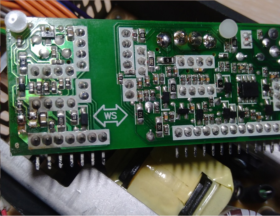 Если есть у кого такой БП под рукой, подскажите пожалуйста, какие детали там стоят? Рядом с керамическим конденсатором вроде тоже такой стоял, а вот крайней слева детали не обнаружил вообще (видимо испарилась).