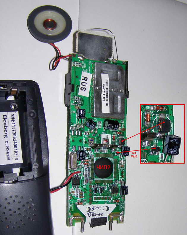 У меня тоже такая трубка Еlenberg CLPD-6335. 12.06.2008 вышла гарантия, а севодня вобще перестала работать. Транзистор Q3 пробит накоротко. Когда ставиш аккумуляторы начинает сильно греться катушка на феорите и ток потребления больше 1А. Насколько я разобралса Q3 транзистор стоит как преобразователь. База запитана с чипа, колектор или сток (незнаю что это за транзистор, он у меня SMD = WJ5) идёт на катушку и диод. С диода сразу на тот самый чип. Я не называю чип потому что он у меня стоит блямба. У ково стоит чип с названием и если у кого схема на даную трубку. Заранее благодарен.
