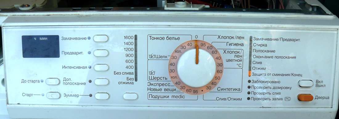 Все кнопки звонятся, ну каждую конечно не проверял, и горит "Конец./защита от сминания". когда к клиенту приехал, вода так в баке с бельем и осталась, не слилась, они даже не знали как люк открыть .Два раза ездил, надоело, взял к себе разбираться.