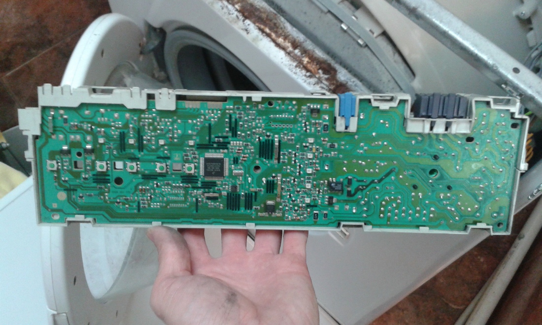 при включении в сеть что-то стрельнуло, вскрытие показало, что на плату попала вода, произошло кз на плате, выгорела дорожка, резистор - после восстановления работа не восстановилась, выгоревшая дорожка шла на процессор управления, на дорожку попало 220 вольт или что-то около этого, подозрение на выход из строя процессора управления  |