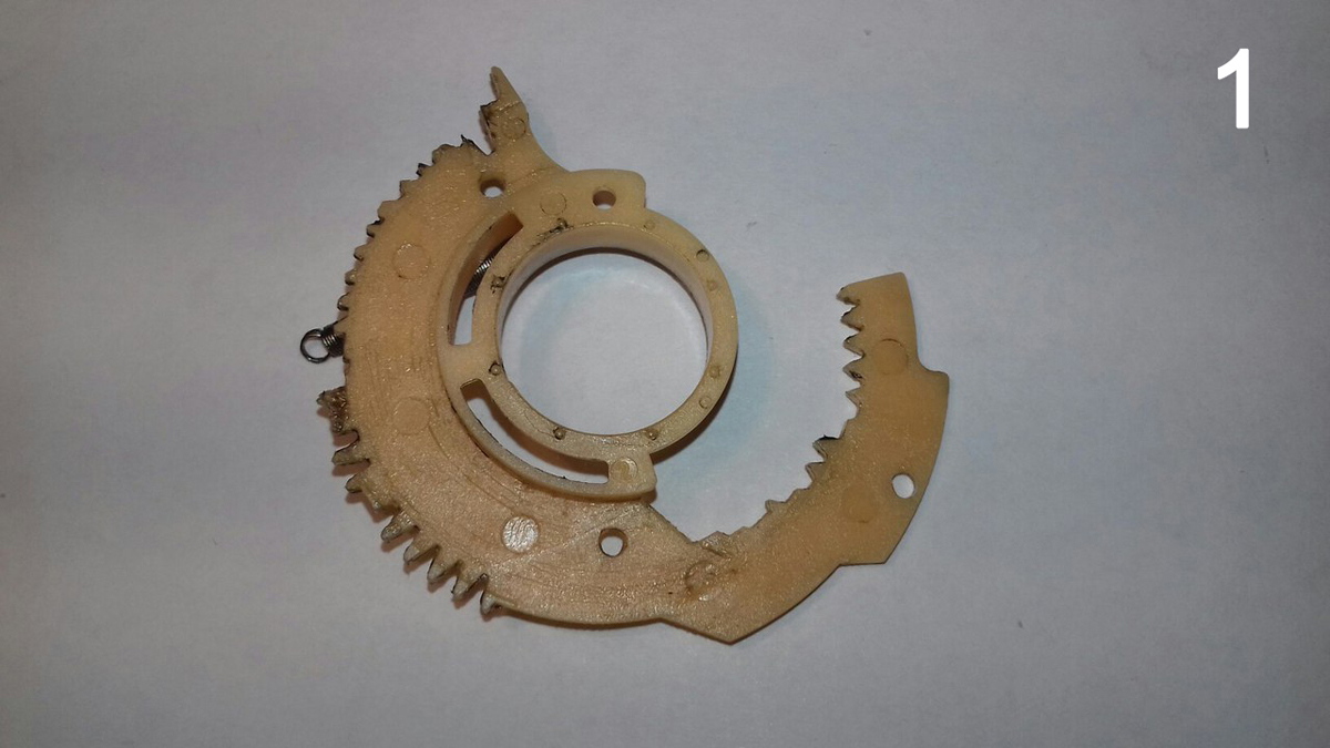Найти правильное положение полумесяца не составило труда. В начале зубчатого ряда имеется углубление, которое и считается начальной позицией. В него вставляется толкатель.