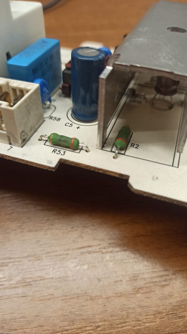 Потом поставил крышку и включил стиралку..... и опять сорвало и залило плату, только сейчас перегорели два резистора R53 и R2 ....