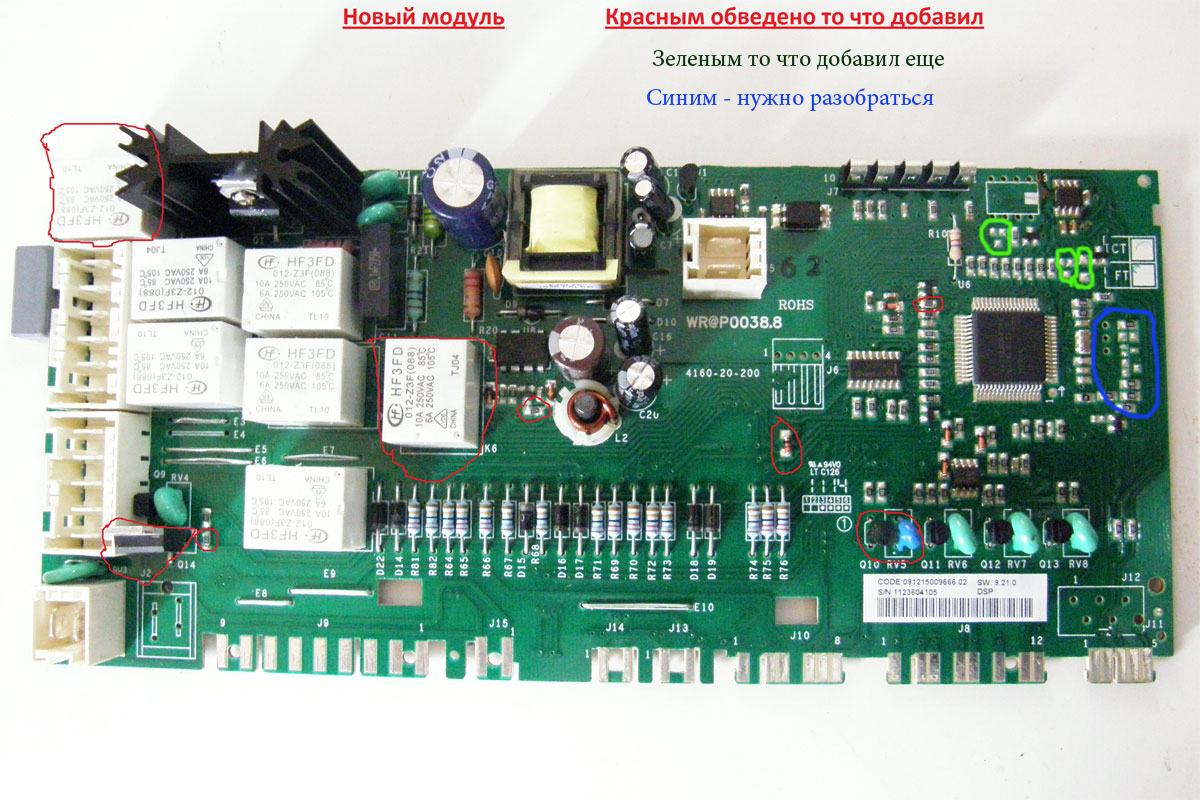 Замок поменял, короткое было на смд кондере его поменяли и до меня(правда упалили еще один симистор).Модуль заказывал не я (я описывал как вышло) То что модуль не такой конечно видно, но там можно переделать если разобраться(не уверен но попробую), добавил 2 реле и управление ими, поставил симистор на сушку, только вот с управлением есть не большие несоответствия, там с проца выходит сигнал на базу транзистора а та новом где посадочное место для транзистора есть, приходится на коллектор. Завтра буду разбираться еще.
