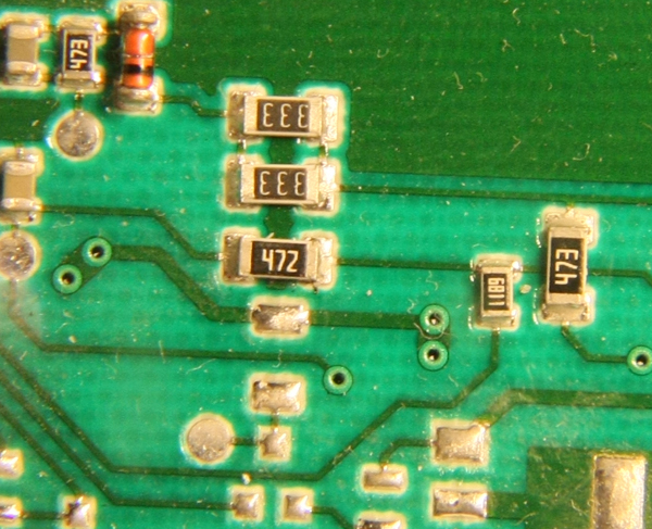 Сгорела дорожка от датчика температуры и два чип резистора.Каковы номиналы? Фото скачал с инета и отметил красным- резисторы.