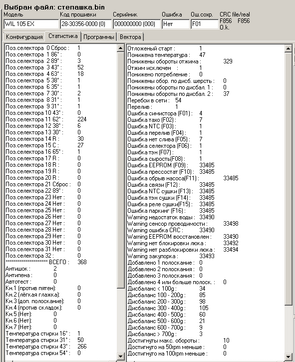 | Степашка писал: | | Впаял мс и ключ прочитал без проблем. Значит косяк в мс, вернее ее содержимом. Клиент видимо чего то не договаривает. Мс вроде как паяная была. Специалистом, красиво. Поставили битую, левую??? Что то с клиентом не так? Уже интригует эта ситуация. | Вот твоя статистика. 368 стирок назад ПЗУ перепрограммировали, т.к. вместо серийного номера - нули. Судя по всему закончились щётки в ЭД. Или " забеременел " фильтрующий конденсатор 680 мкФ.