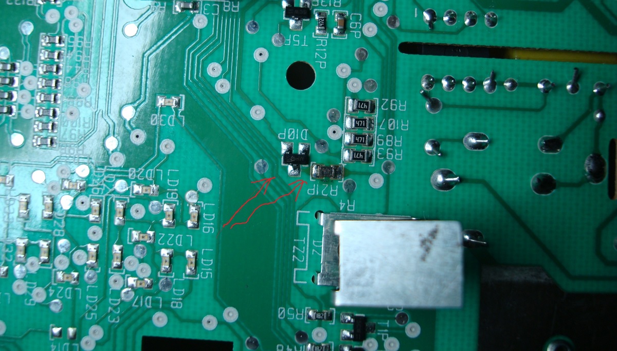 | крупным планом резистор R21P и диод D10P указаны красными стрелками | |