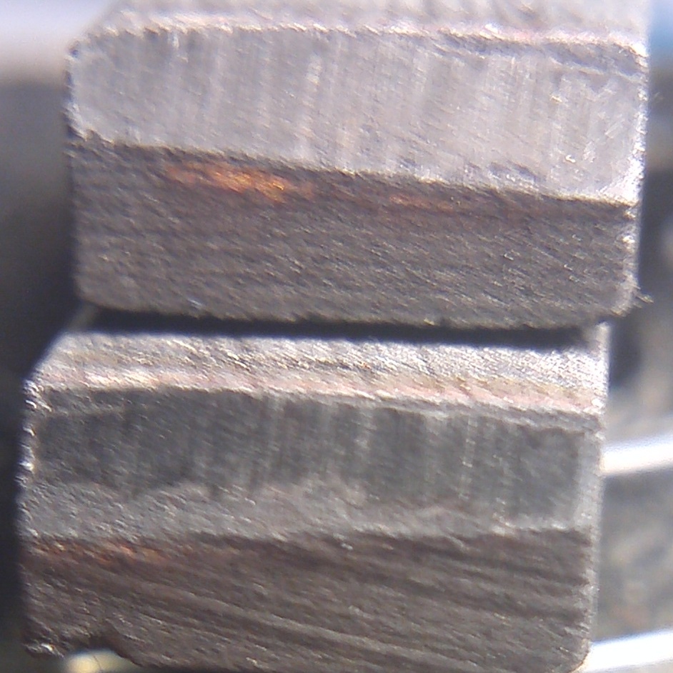 Специально для тебя сделал фото с тестового двигла. Телефон Philips Xenium X806, сделано в Китае, через лупу 7х. Он (телефон) резкость подстраивает. Щетки не притирал, они от пылесоса, 5х10, двигло от Лыжи, тестовый, уже два года как пользуется под каждый модуль. Фото "щетка1" и "щетка2" - отдельно каждая из них. Фото "коллектор" в комментариях не нуждается. Фотографии "щетка1", "щетка2", "коллектор" подсвечивала вспышка, переделывать не стал, и так понятно. Если попросишь, переделаю. Фото "обе1" и "обе2" - те же щетки совместно в разных ракурсах при косом освещении, чтобы виднее были дорожки износа-притирки. Фото "наложение1" и "наложение2" - собственно не фото как таковое, это результат совмещения следов износа на двух щетках из фото "щетки1" и "щетки2" соответственно. Кто не верит - может повторить.
