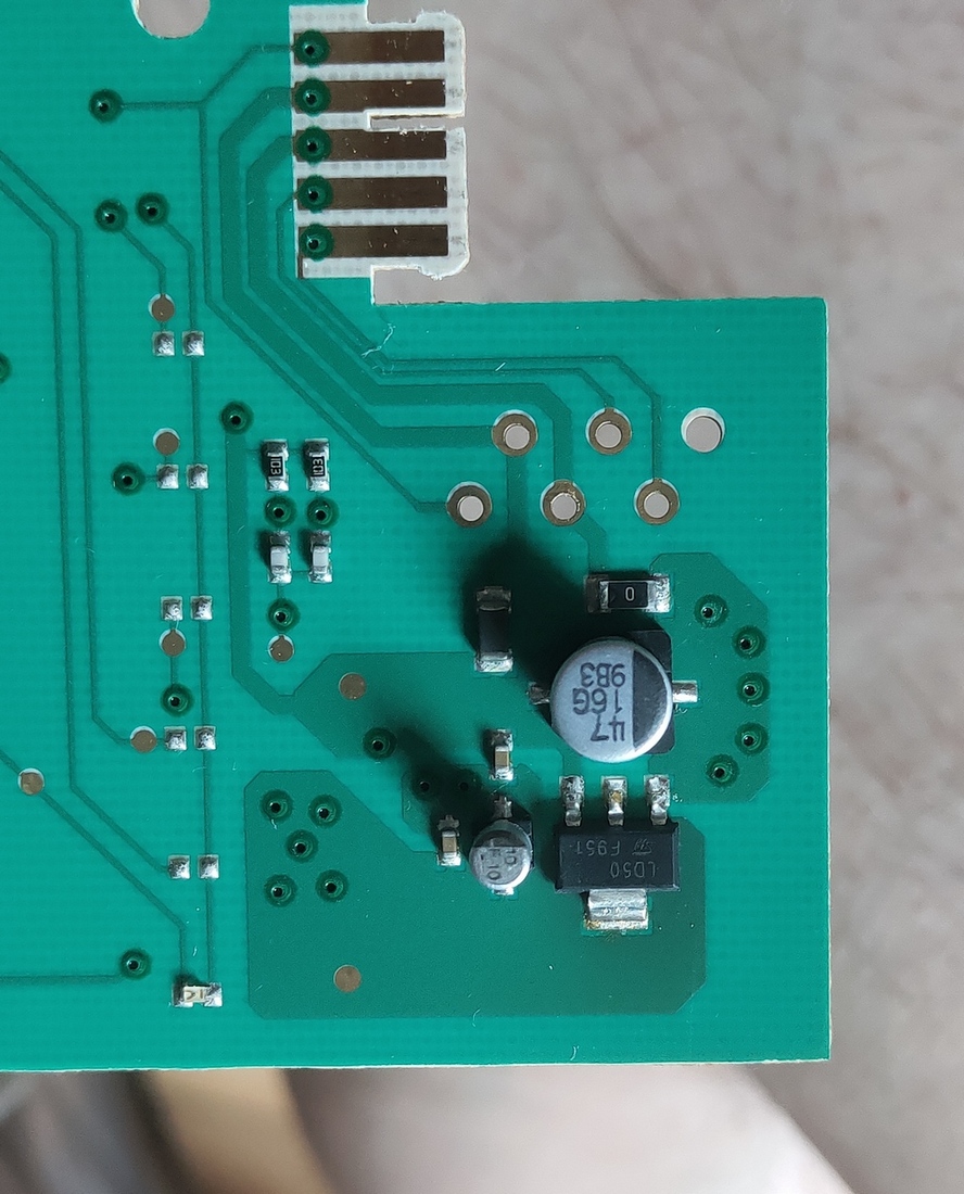 Вскрытие показало, что дико греется стабилизатор LD50 (LD1117S50CTR) и пара электролитов рядом с ним. На входе у LD50 +12В, на выходе +5В, ток 210 мА. Постукивание по стабилизатору приводит к пропаданию питания. Заменил LD50 и электролиты. На LD50 посадил соплю для лучшего теплоотвода. Итог: индикация работает, машинка стирает, но стабилизатор по-прежнему как утюг. А всё потому, что, как оказалось, очень сильно греется проц R5F212BASNFP. Кроме того, заметно нагреваются резисторы по 820 ом на транзисторных ключах индикатора. Понятно, что при таком нагреве ни стабилизатор, ни проц долго не протянут.