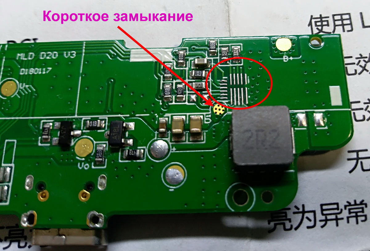 Power Case no name. Не заряжается, не заряжает, обнаружено КЗ в контрольной точке V1 (стрелка на фото). В инете информации по микрухе не нашли.