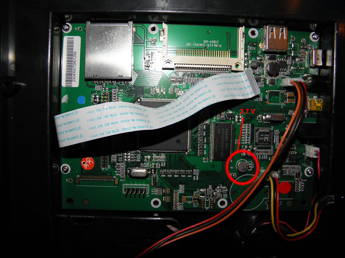 Фоторамка перестала включаться сама по себе.Питание горит.В динамике при включении присутствует шум, если прислушиваться.Экран признаков жизни не подает(матрица LQ104V1DG83).Схема питания потсветки запитана 12в.Есть еще каких то два провода, я так полагаю туды подаються команды на выдачу схемой высокой напруги для питания подсветки экрана и 5В(это напряжение если оно должно быть не зафиксировано).Замер батарейки показал 2,7 В...по идее 3 вольта должно быть или я не прав?.Вобщем не знаю что с этим трупом делать.Какие у кого предположения решения есть поделитесь.Спасибо!
