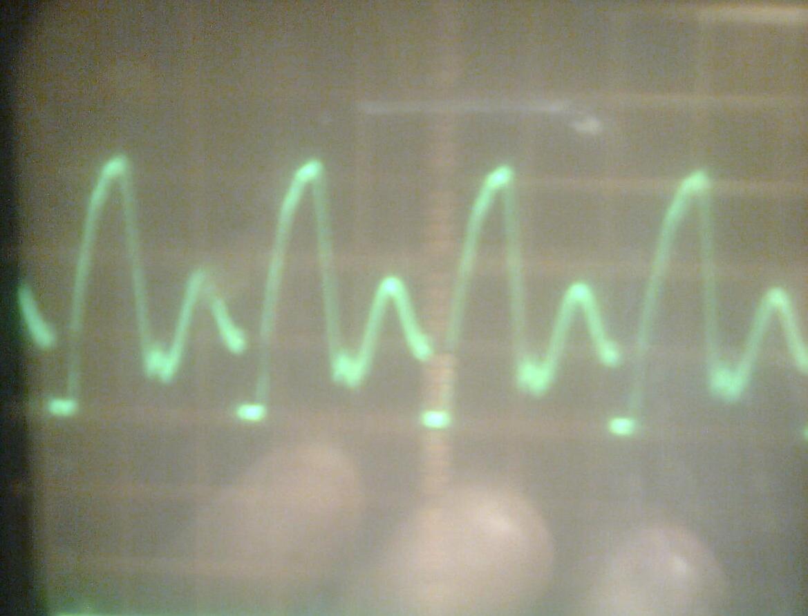 Возле точки подключения +310 на плате разрезал дорожку,провода к лампочке 12-15см,пробовал включить без лампочки(всё равно выглядывали по 5-6см.провода,я их замыкал)-осциллограмма ещё хуже.Я ставил по одному питанию м-схему 7815 вместо PZT2222,мне рекомендуют поставить на место транзистор,пока не нашёл.Эта петля из проводов может тоже искажать?