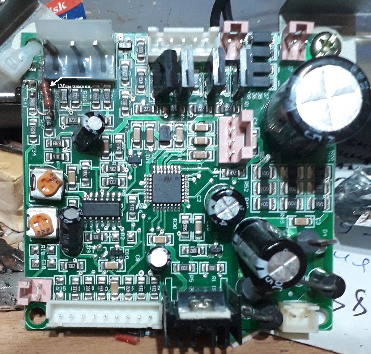 Я белым цветом отметил дорожки,которые испарились.Делитель проверил.Сгорел один смд резистор 1Мом,первый от разъема питания,с правой стороны.Заменил на обычный резистор.Остальные выжили.