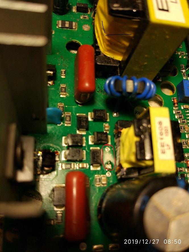 Вот по ближе один вывод элемента идёт на сопротивление smd 104 100к в параллель с 104 ёмкость второй вывод элемента ва ножку трансформатора!