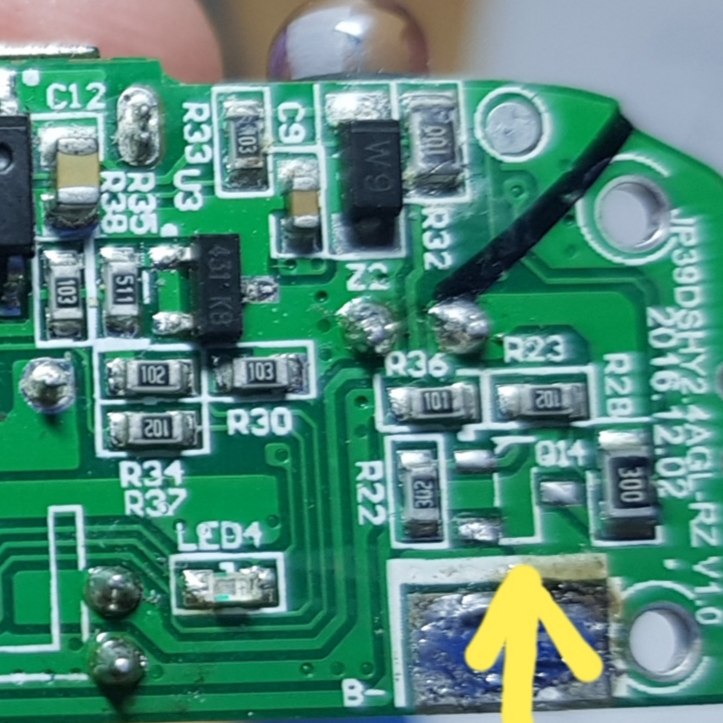 Отвалилась деталь с тремя контактами. Без этой детали постоянно горят светодиоды индексации заряда и не горит светодиод фонарика. Какой элемент можно поставить? |