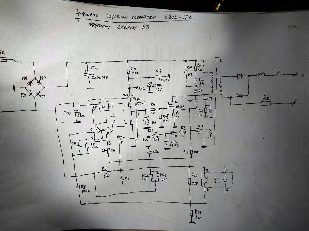 Пипец а не зарядное...смесь чего то с чем-то...Во первых схема включения 3842 хрен знает что...додумались ШИМ на панельку влепить,..элемент как керамический конденсатор маленький желтенький (в цифровых схемах часто стоит по питанию) так вот стоит он по обозначению на плате как RV 3 звонится накоротко....на двух блоках причем..один правда выгорел немного другой внешне целый..ШИМ3842 релаксирует..на выходе все нагрузки в норме ...менял диод выходной, трансформатор с другого ставил транзистор полевик силовой менял....схему сам бы хрен срисовывал особенно в части регулирования через оптопару на СМД компонентах...В общем стоит ПИК16Ф73..на маленькой платке...подключен через ЛМ324 на оптопару а та уже к 3842...такая замутная зарядка.