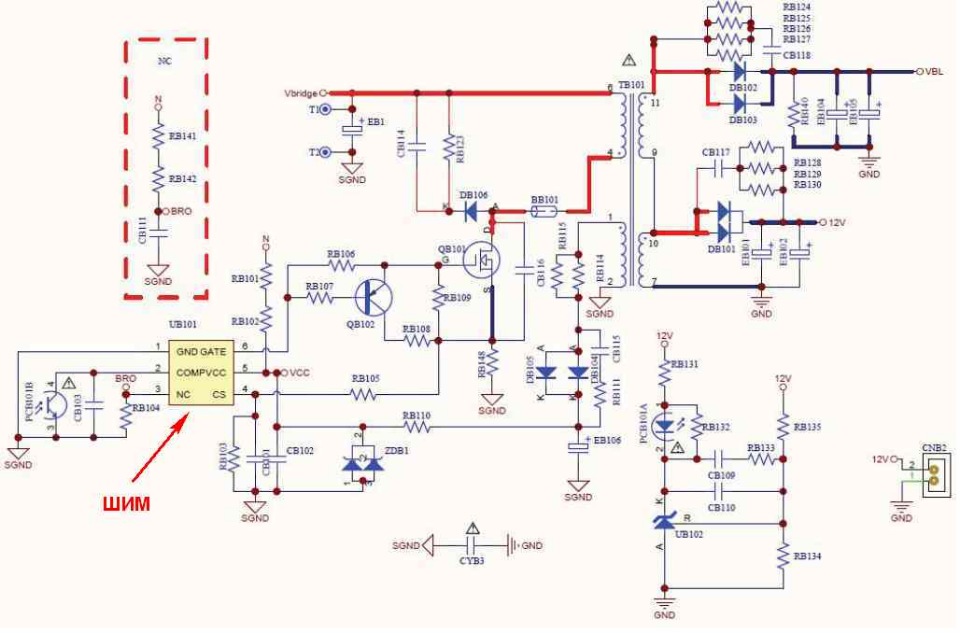 В блоке питания ( main TP.RT2984T.PB801) сгорел MOSFET, ШИМ, вся ихняя обвязка (подсветка). БП на 12В рабочий. Интересуют номиналы резисторов и конденсаторов . Похожие схемы есть, много, но без номиналов, или сомневаюсь, так как большой разброс. Уже пытался запустить, но пока безрезультатно (с ШИМкой SG6859ATZ). Одна из схем и фото.